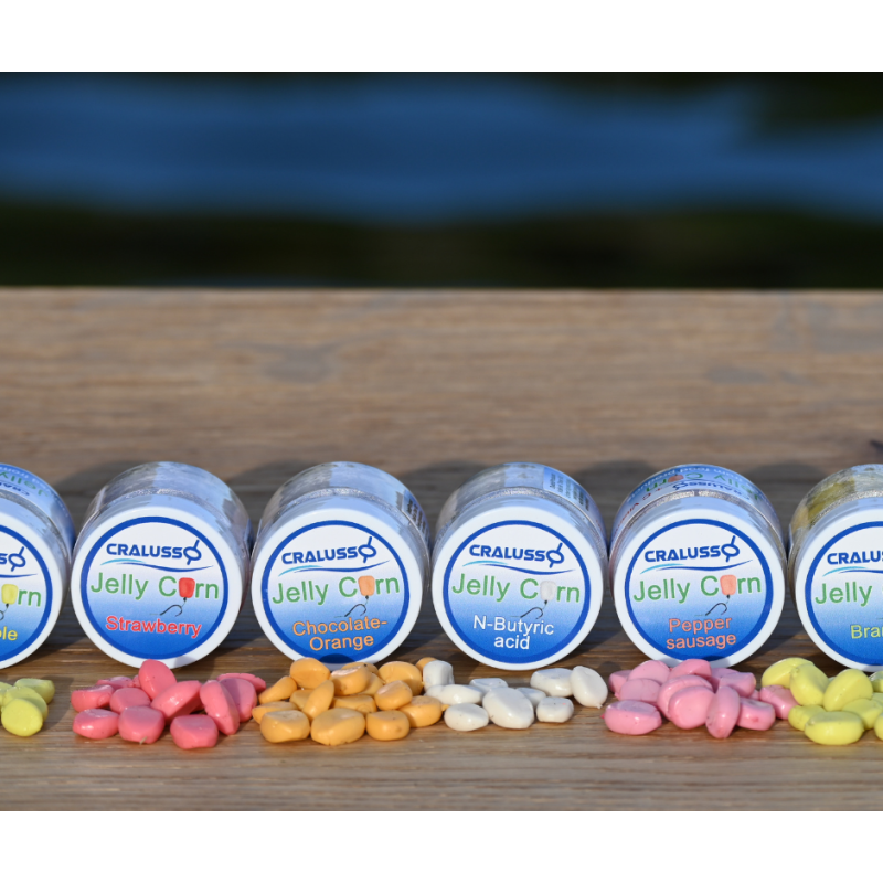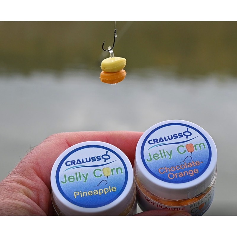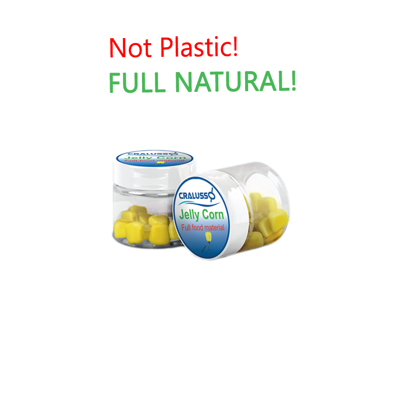 A Cralusso által kifejlesztett és gyártott új, környezetbarát Jelly Corn gumi kukoricák, élelmiszer ipari, alapanyagok felhasználásával készülnek. A természetes alapanyagokból gyártott, Jelly Corn, a már ismert gumi kukoricához hasonlóan, rugalmas állagú. Ez az új generációs gumi kukorica, a halak számára emészthető, lebomló horogcsali. Az ételfestékekkel színezett, különböző ízű Jelly Corn kukoricákat a halak szívesen fogadják, rendkívül eredményes horgászatot tesznek lehetővé.