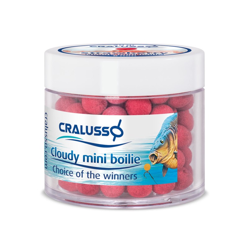 A CLOUDY elnevezésű, eper ízesítésű oldódó, lebegő, felhősödő mini bojlik többféle ízben, színben és méretben állnak a horgászok rendelkezésére. Az intenzíven aromázott, színezett bojlik homogén anyag szerkezete, folyamatosan engedi magából a csalogató aroma felhőt. Oldódás közben a felületén plazmaszerű, selymes tapintású burkolat keletkezik, melyet a halak különösen kedvelnek. A Cloudy mini bojlik kiemelkedő fogást eredményeztek - a Cralusso teszthorgászai által - a hazai és nemzetközi vizeken végzett tesztelések során!