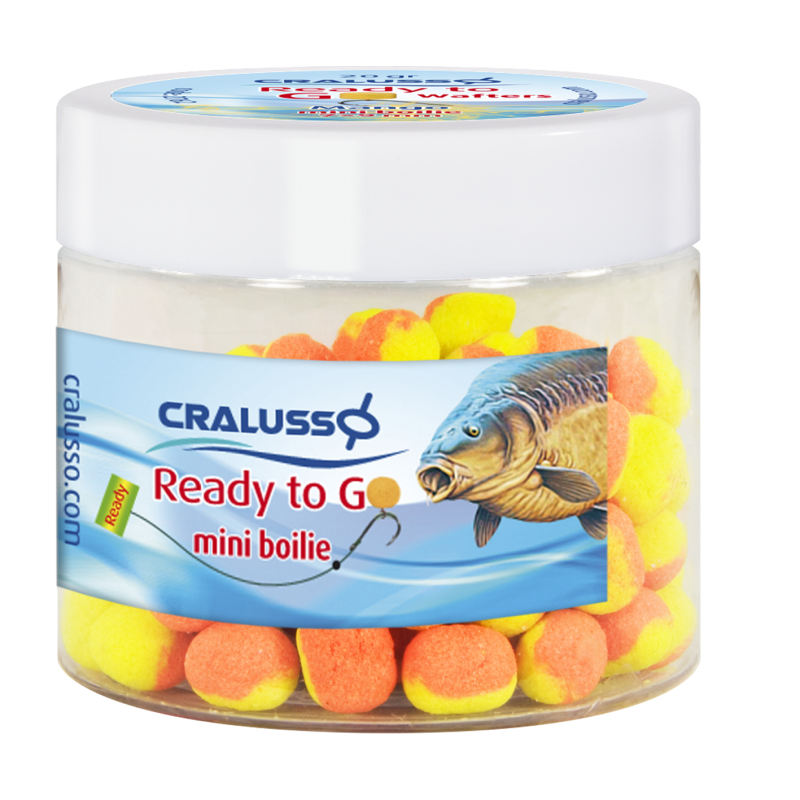 A Cralusso feeder programjának egyik nagyon praktikus újdonságát, sok horgász fogja kedvelni. Nem kell bajlódni a method előke és csalitüske megkötésével, összeállításával, a csali besúlyozásával. A Cralusso cég, Ready to Go névre keresztelt horogcsalis dobozaiban, egy előkötött, használatra kész csalitüskés előkéket találunk. A szerelék minden része harmonizál, az adott méretű csalihoz, optimális méretű és súlyozott horoggal és hozzá illő vastagságú előkével kerül a dobozba. Nincs más dolgunk, mint a kész, csalizott előkét felakasztani a szerelék method kapcsába. A Ready to Go minibojlik különböző ízekben, színekben, 8-8x12-10 és 9x11 mm-es méretben kerülnek forgalomba.