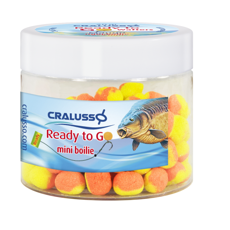 A Cralusso feeder programjának egyik nagyon praktikus újdonságát, sok horgász fogja kedvelni. Nem kell bajlódni a method előke és csalitüske megkötésével, összeállításával, a csali besúlyozásával. A Cralusso cég, Ready to Go névre keresztelt horogcsalis dobozaiban, egy előkötött, használatra kész csalitüskés előkéket találunk. A szerelék minden része harmonizál, az adott méretű csalihoz, optimális méretű és súlyozott horoggal és hozzá illő vastagságú előkével kerül a dobozba. Nincs más dolgunk, mint a kész, csalizott előkét felakasztani a szerelék method kapcsába. A Ready to Go minibojlik különböző ízekben, színekben, 8-8x12-10 és 9x11 mm-es méretben kerülnek forgalomba.